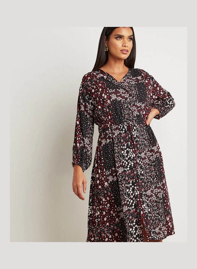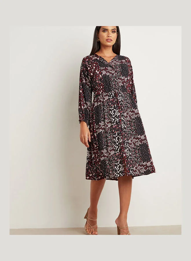 Floral Printed V Neck A-Line Midi Dress Multicolour