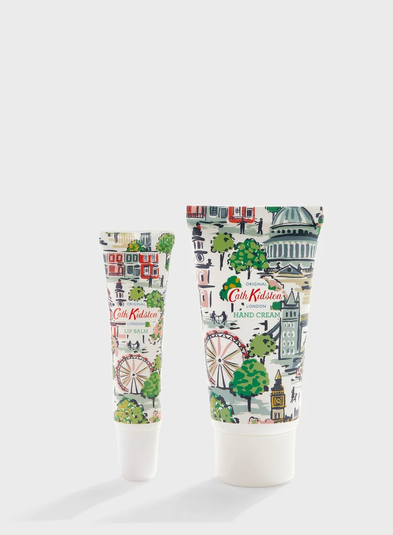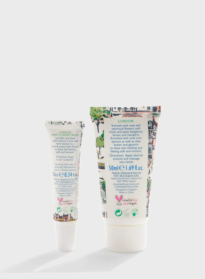 A pretty tin embossed with iconic London landmarks with a mint and sweet basil beeswax lip balm and enriching hand cream.