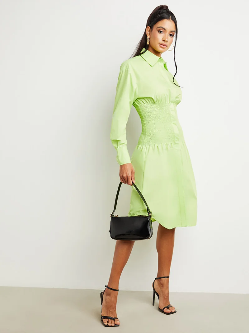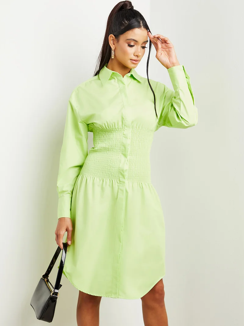 Closet By Styli Shirred Waist Concealed Button Shirt Midi Dress Green