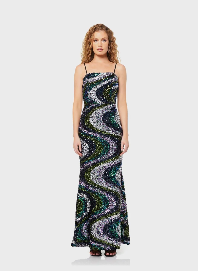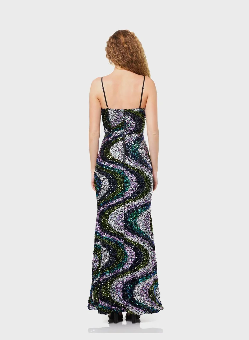 This sleeveless column dress features a wavy pattern in shimmering sequins of green, white, and purple. The dress has delicate spaghetti straps and a floor-length silhouette.