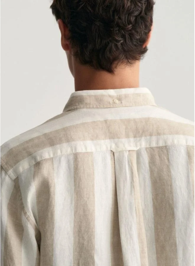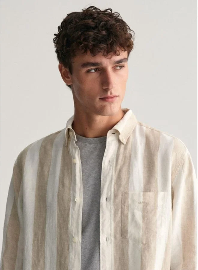 Made from 100% linen, a naturally breathable and lightweight fiber, this regular fit shirt has a crisp look that lends itself well to smart casual summer events. Patterned with bold yarn-dyed stripes, it features a button-down collar, curved hem, a chest pocket with logo embroidery and a locker loop at the back. A versatile piece that pairs well with shorts, jeans and tailored pants alike, this shirt is a summertime staple that you'll wear for many years to come.