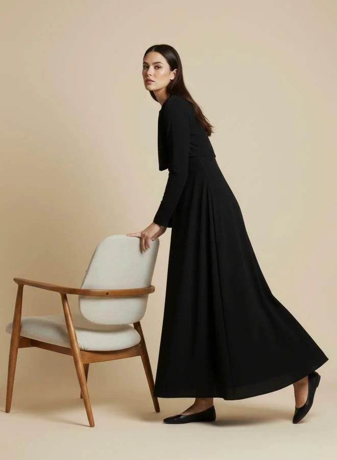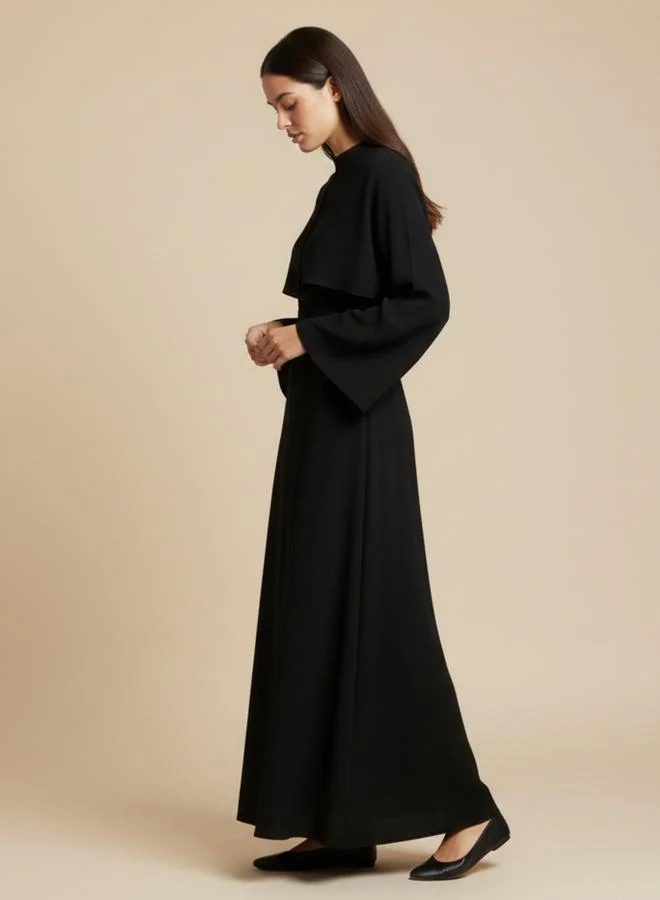 Sophisticated black maxi dress crafted from smooth woven fabric in a flattering A-line silhouette. Featuring a chic high neck with a front slit, long bell sleeves, and a distinctive cape overlay bodice. Perfect for refined daytime events or evening gatherings.
