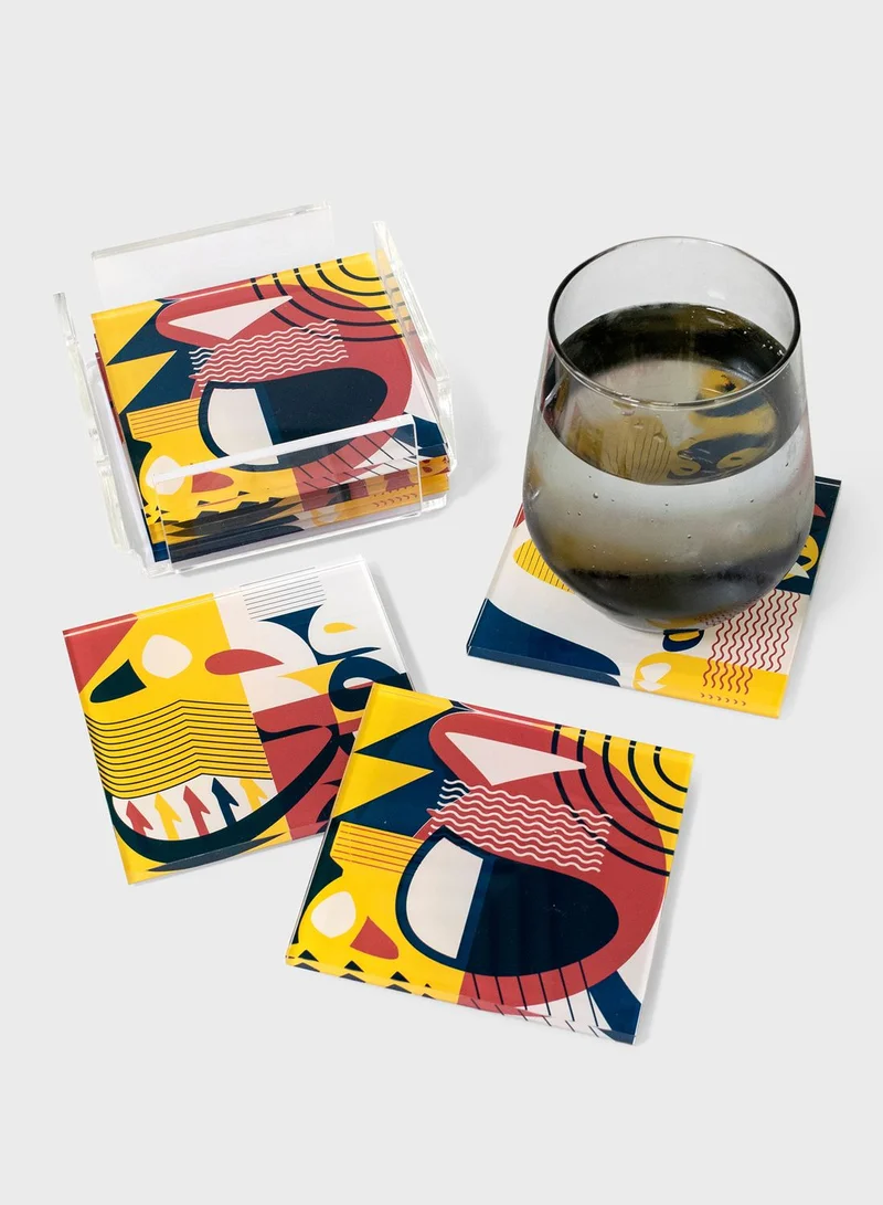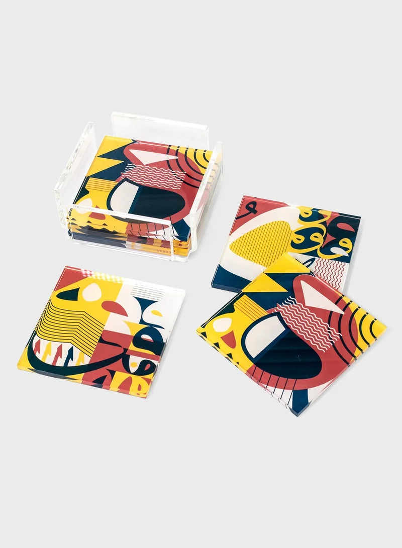 This set of 6 acrylic coasters boasts a strong presence on your tabletop. The design’s primary colors and experimental approach with the Arabic letterforms create a striking set. Each set contains three distinct patterns.