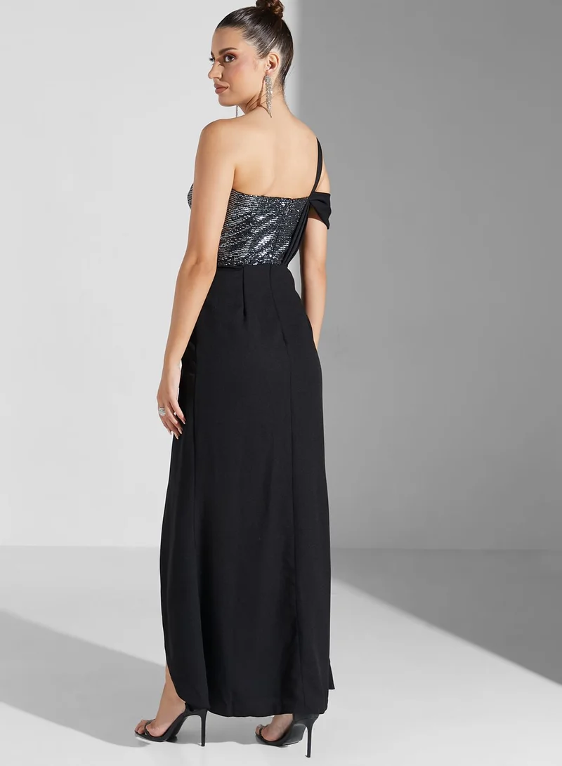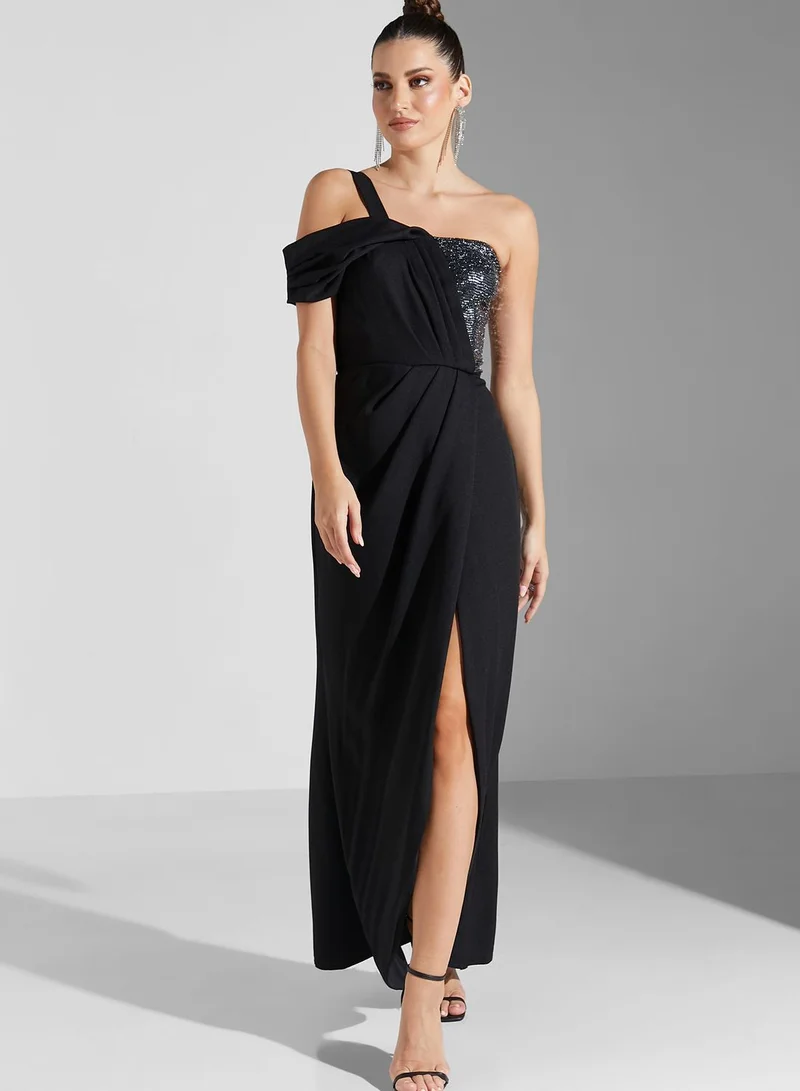 Namshi x Sabrina Shimmer Bust Off Shoulder Slit Dress