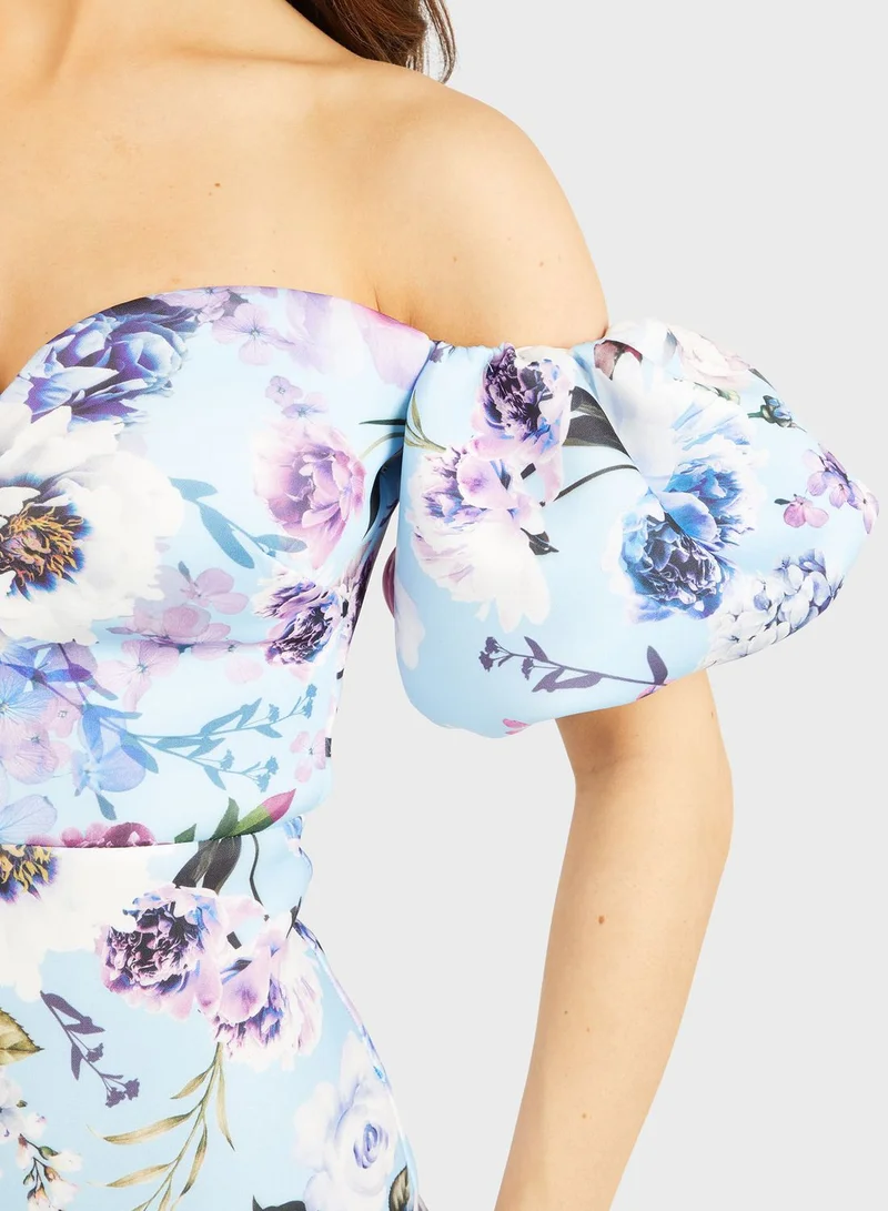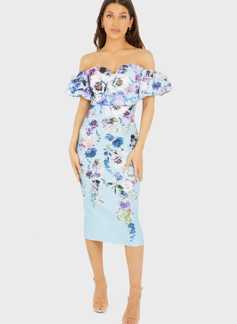 QUIZ Bardot Floral Print Ruffle Detail Dress