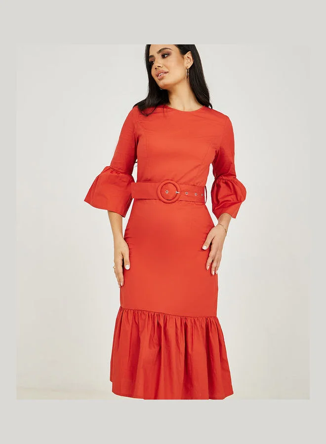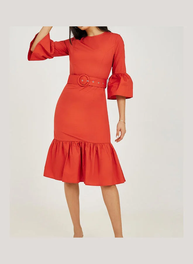 Styli Bell Sleeves Cotton Sheath Midi Dress with Belt