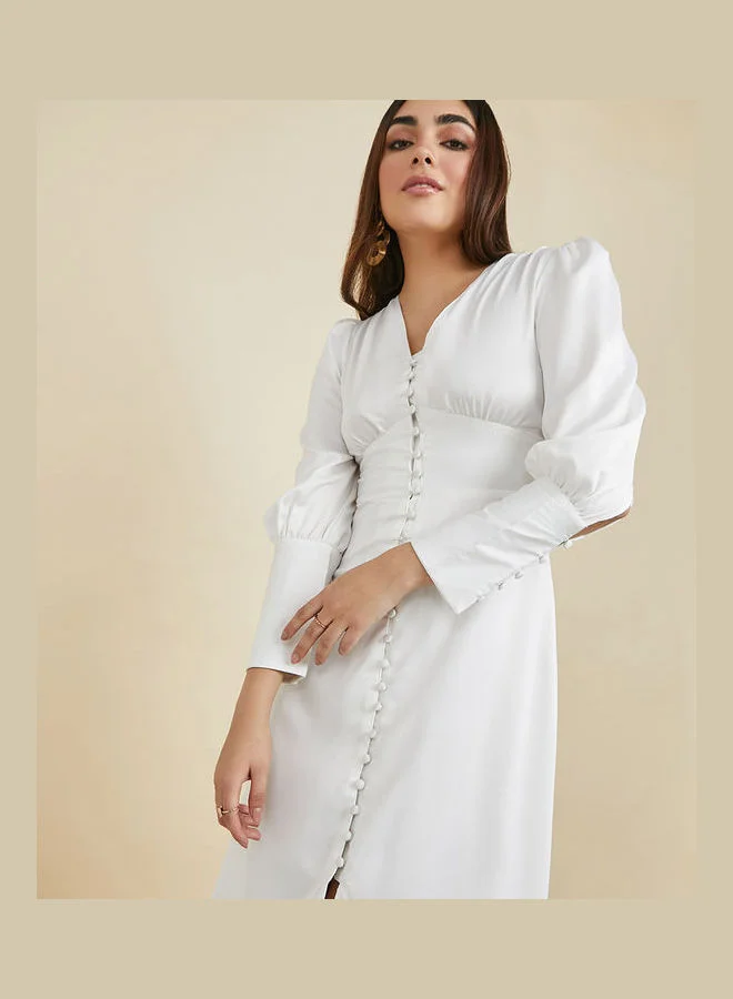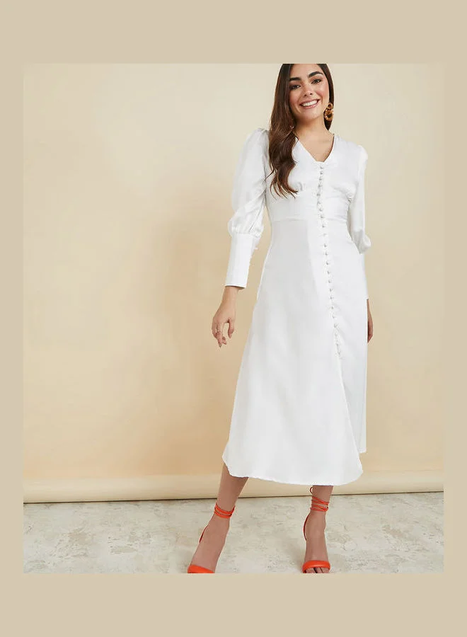 Styli Cuffed Sleeves Button-Loop Detail Sheath Midi Dress