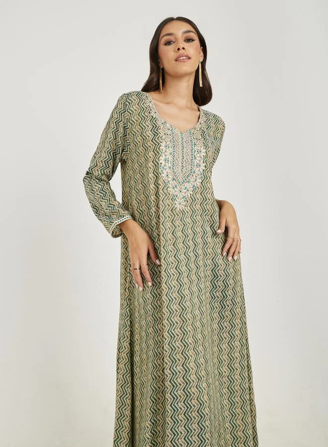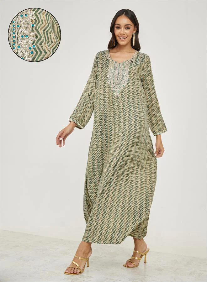 Styli Embroidery Neck Chevron Print Cotton Jalabiya