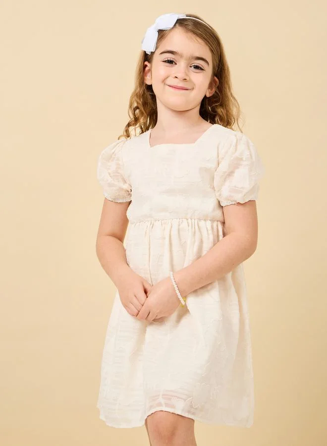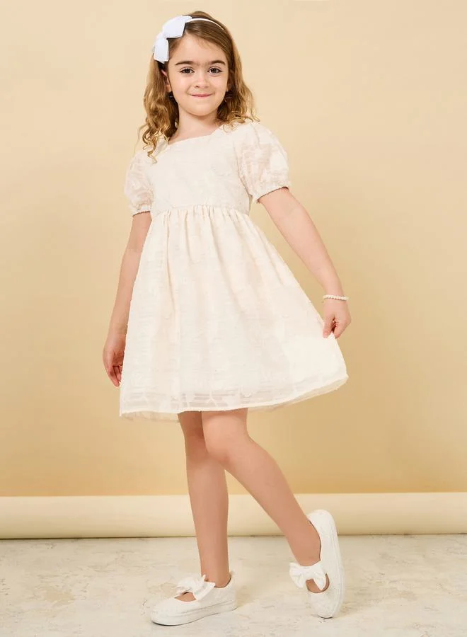 Styli Jacquard Mesh Detail Puff Sleeve Dress