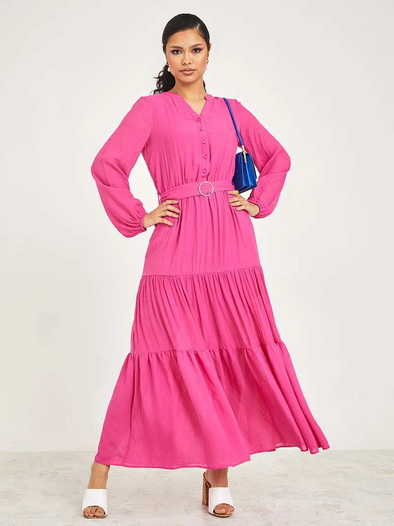 Styli Long Sleeves Solid Tiered Maxi Dress with Belt