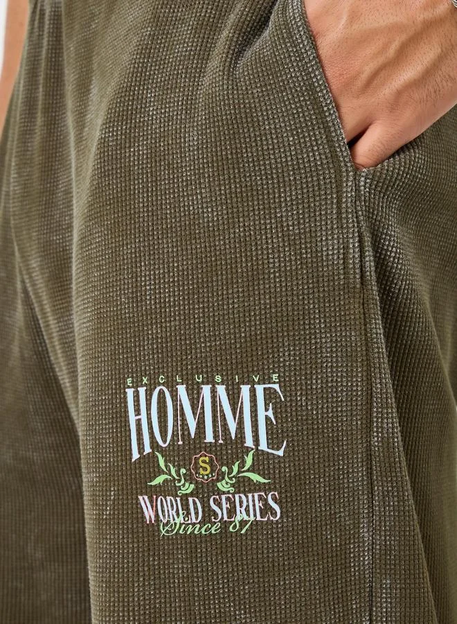 Olive green relaxed fit joggers crafted from breathable waffle knit cotton. Featuring a comfortable elasticated waistband and cuffs, these pants offer practical side and back pockets. Finished with a vintage-inspired "HOMME WORLD SERIES" graphic on the thigh, they are perfect for casual outings or laid-back lounging.