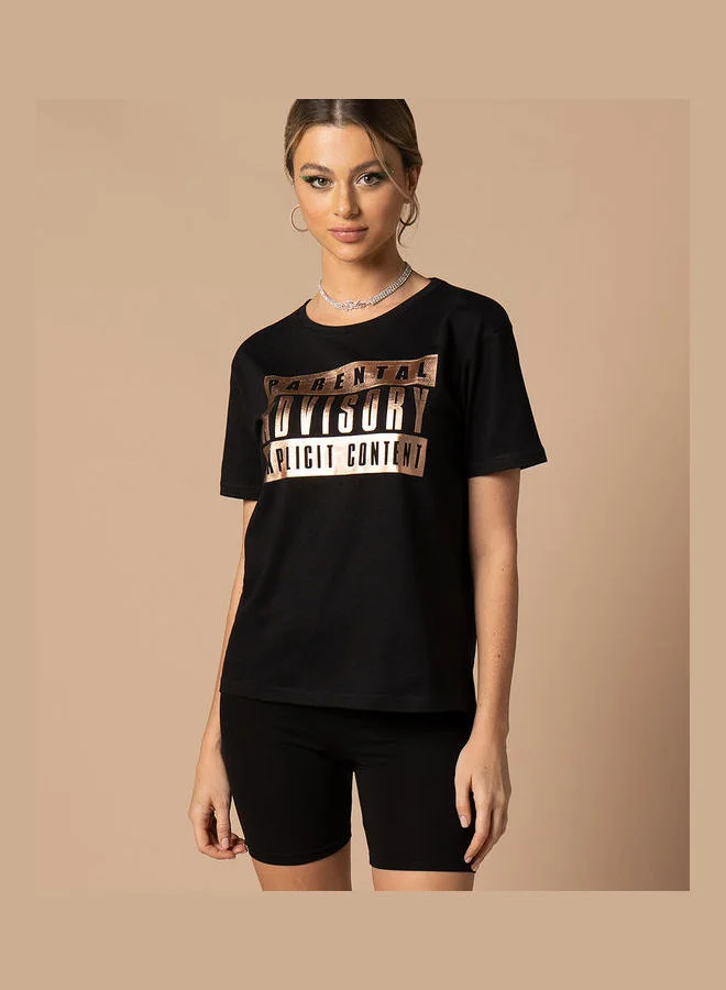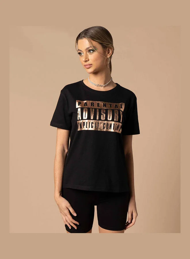 Styli Parental Advisory Foil Print Regular Fit Tshirt by Styli