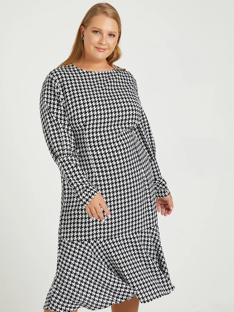 Plus Long Sleeve Houndstooth Print Fit and Flare Midi Dress