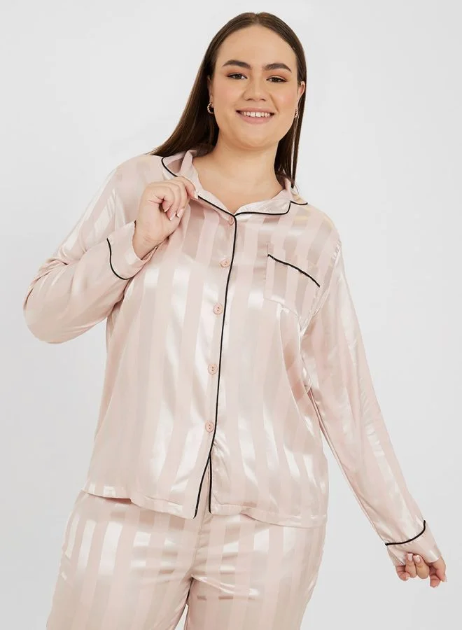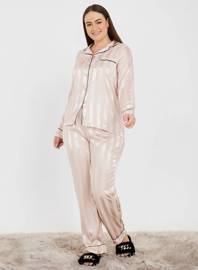 Styli Plus Satin Stripe Shirt & Straight Trouser Pyjama Set