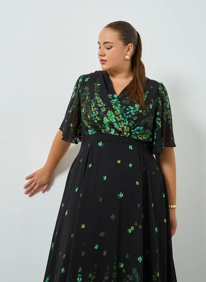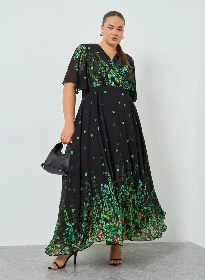 Styli Plus Size Green Embellished Floral A-Line Maxi Dress