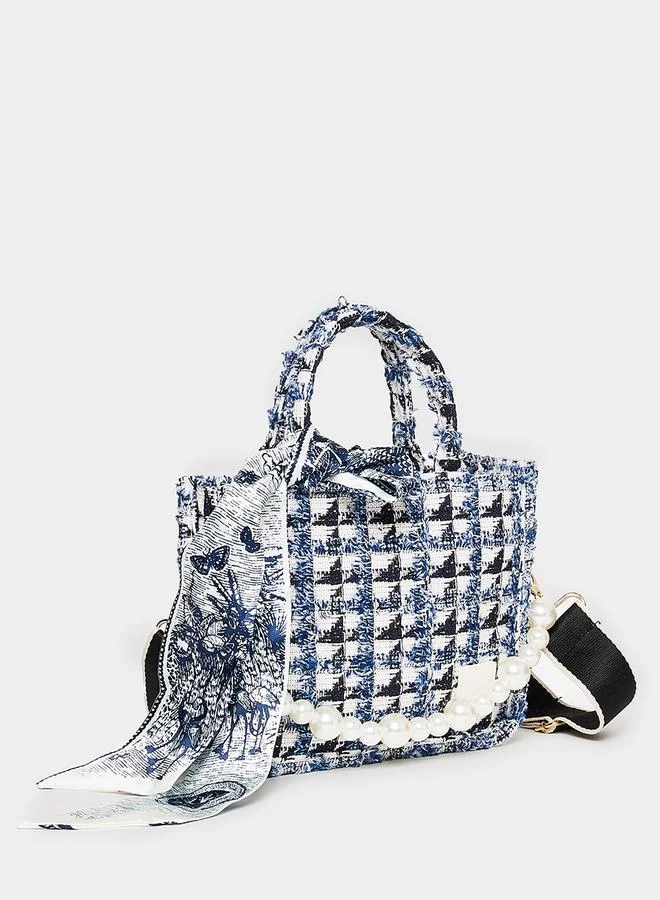 Ribbon Detail Tweed Tote Bag With Pearl Chain