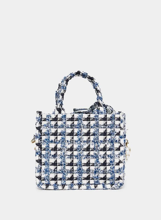 Styli Ribbon Detail Tweed Tote Bag With Pearl Chain