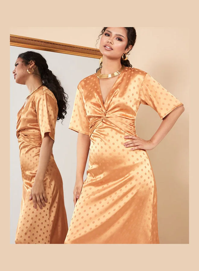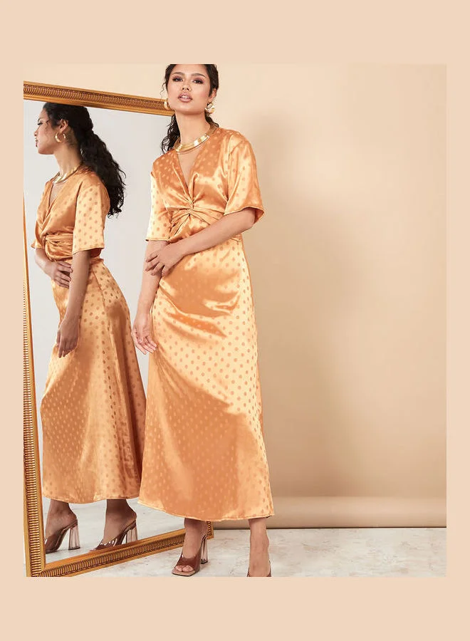 Styli Short Sleeves V Neck Front Twist Satin A-Line Maxi Dress
