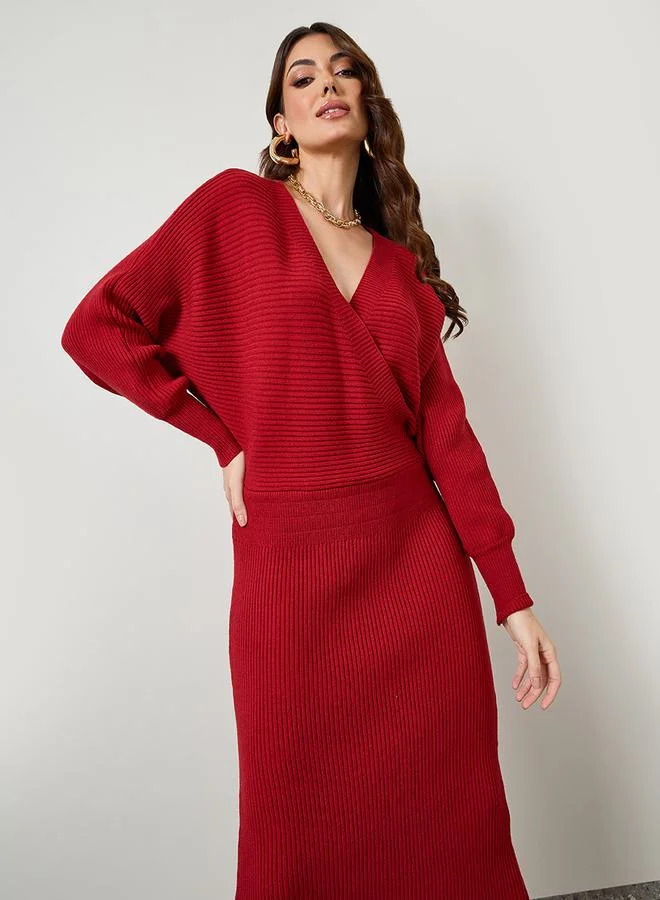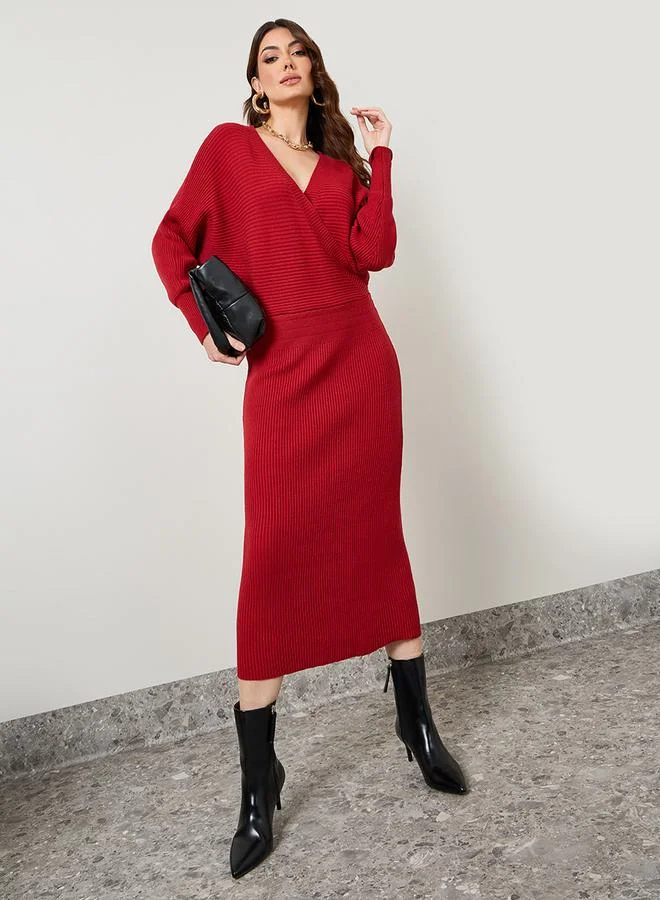 Styli Wrap Front Ribbed Sweater Midi Winter Dress
