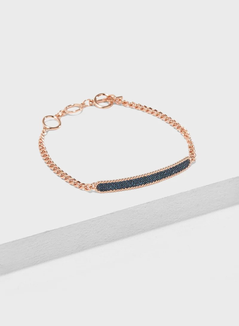 Be right on-trend this summer with this must-have bracelet featuring a T-bar closure, which can be adjusted to three different lengths. Certain to brighten up any outfit, the rose gold-plated design also features sparkling blue crystal pave and a mini gourmette chain.