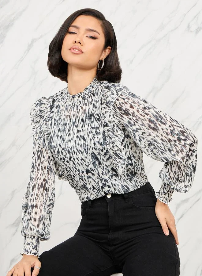 Ruffle Detail Metal Leopard Print Blouse