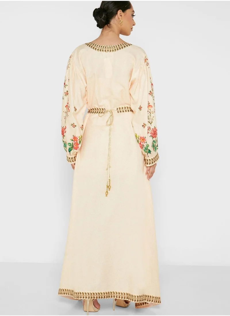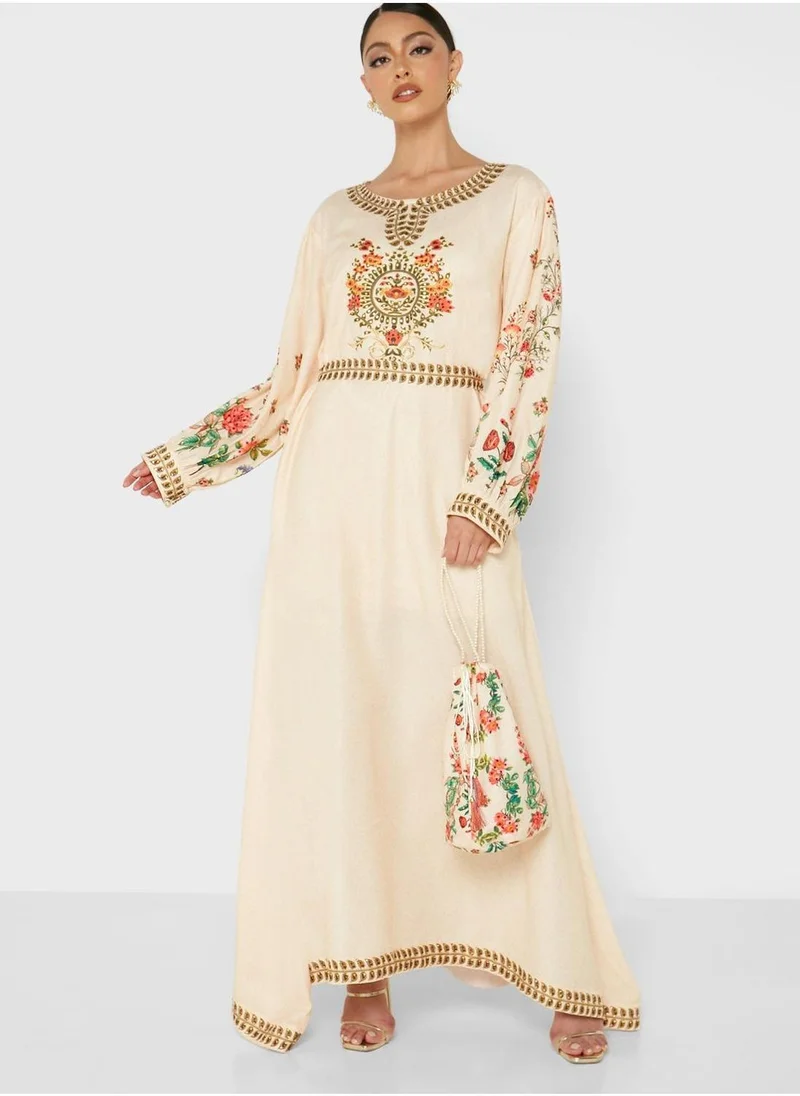 Find elegance in simplicity with this beautifully tailored Jalabiya with floral prints from Arabian Closet.