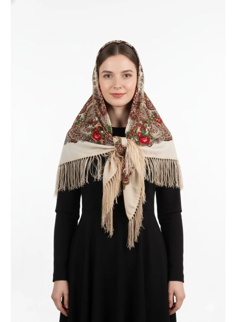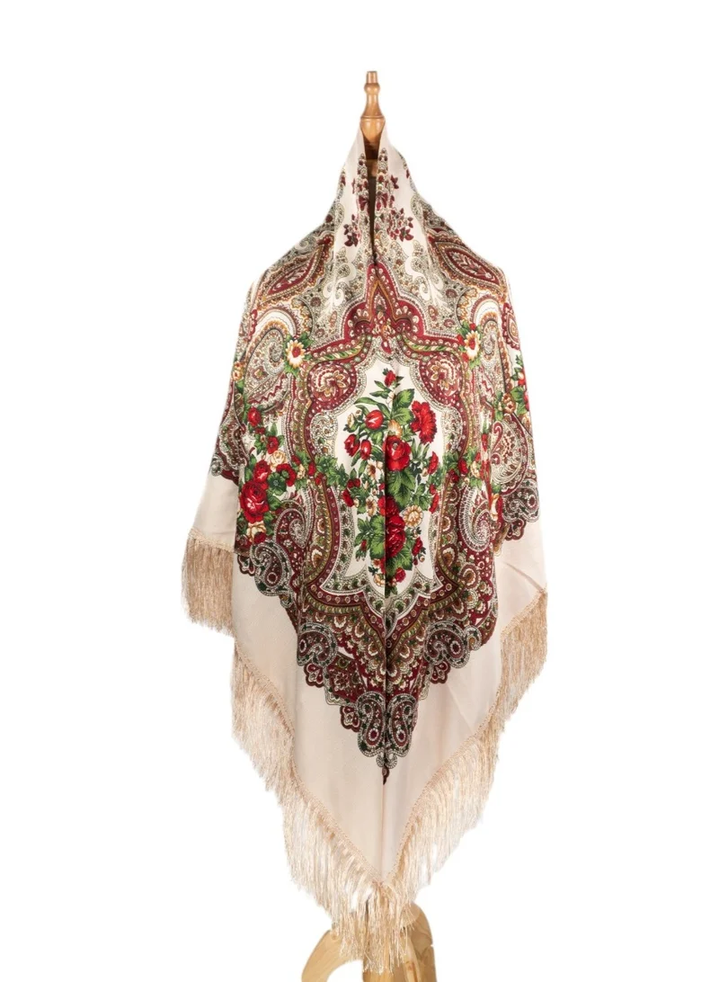 Embrace timeless elegance with this Russian-Ukrainian inspired shawl, featuring vintage patterns and vibrant colors designed to elevate any outfit. This versatile piece transitions seamlessly through the seasons: use it as a chic summer wrap in air-conditioned spaces or a stylish bikini cover-up. In cooler months, it transforms into a cozy infinity scarf or a blanket shawl to keep you warm.