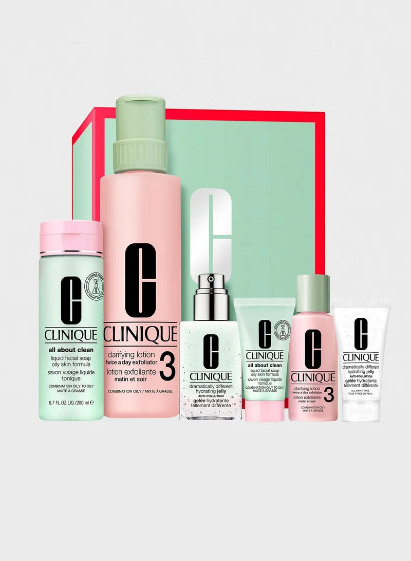 Three signature steps for glowing skin with our lightweight, water-jelly moisturizer. Full- and travel-sized routines customized for oilier skins. Ultra-hydrating 3-Step skin care - in full and travel sizes, to give oilier skin exactly what it needs to be great skin. Liquid Facial Soap cleanses gently, Clarifying Lotion helps clear dulling flakes for smooth, glowing skin and Dramatically. Different Hydrating Jelly delivers 24-hour hydration and uses Clean Shield Technology to lock in the good - like moisture - and filter out the bad. 3 - Combination Oily or 4 - Oily. Just happy skin.