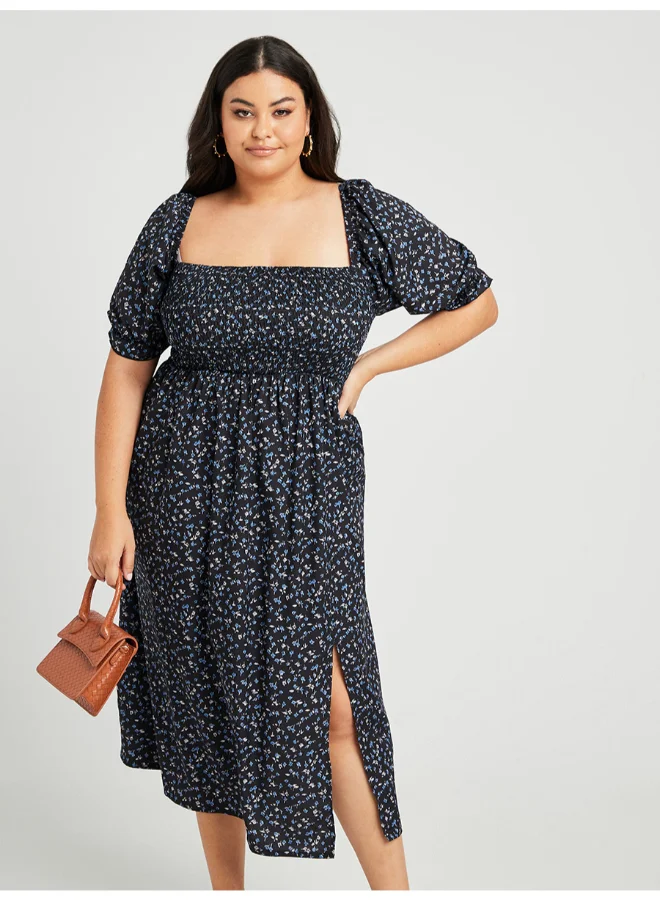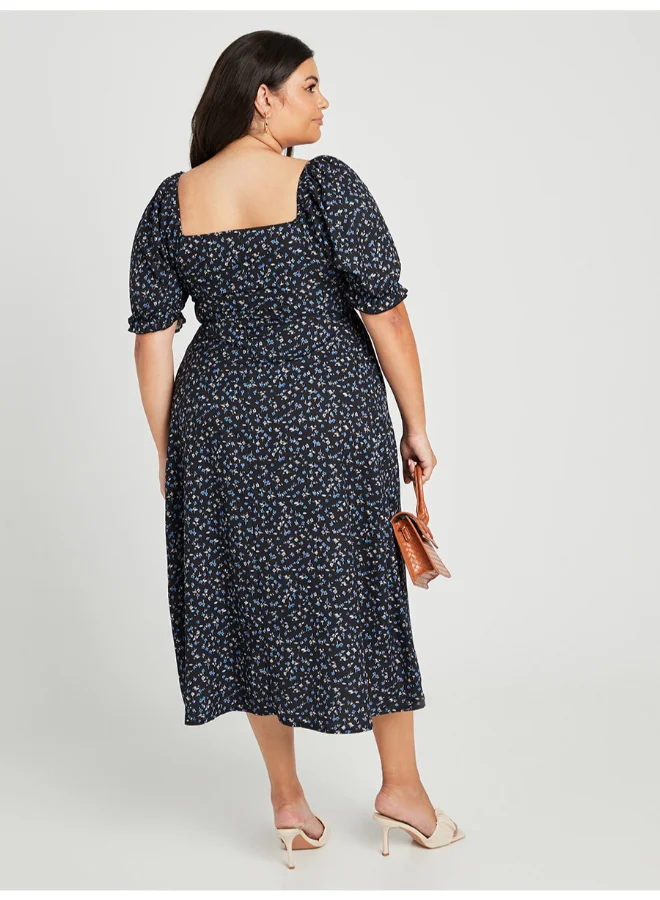 Closet By Styli Ditsy Print Puff Sleeve Midi Dress Multicolour