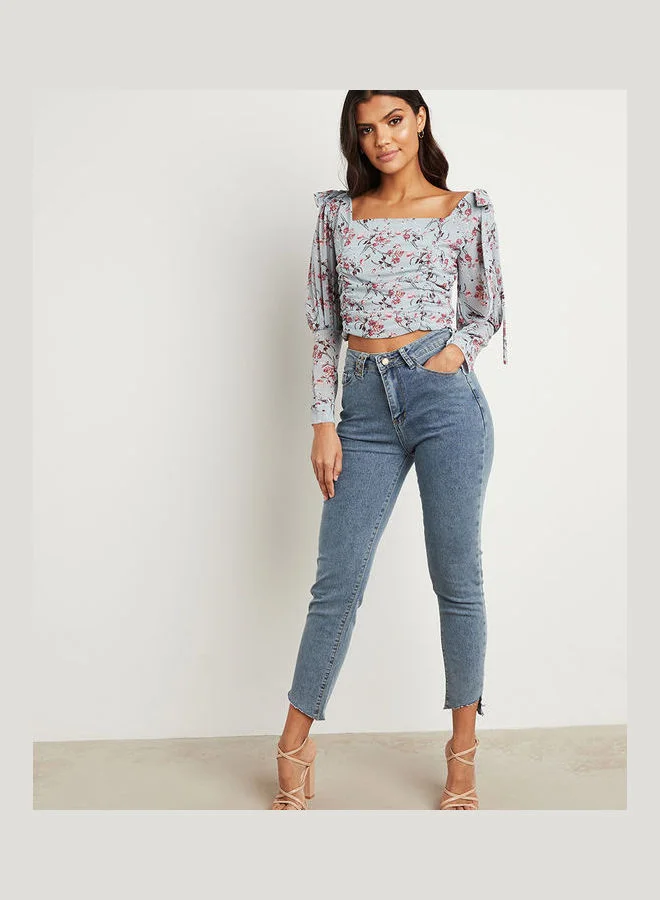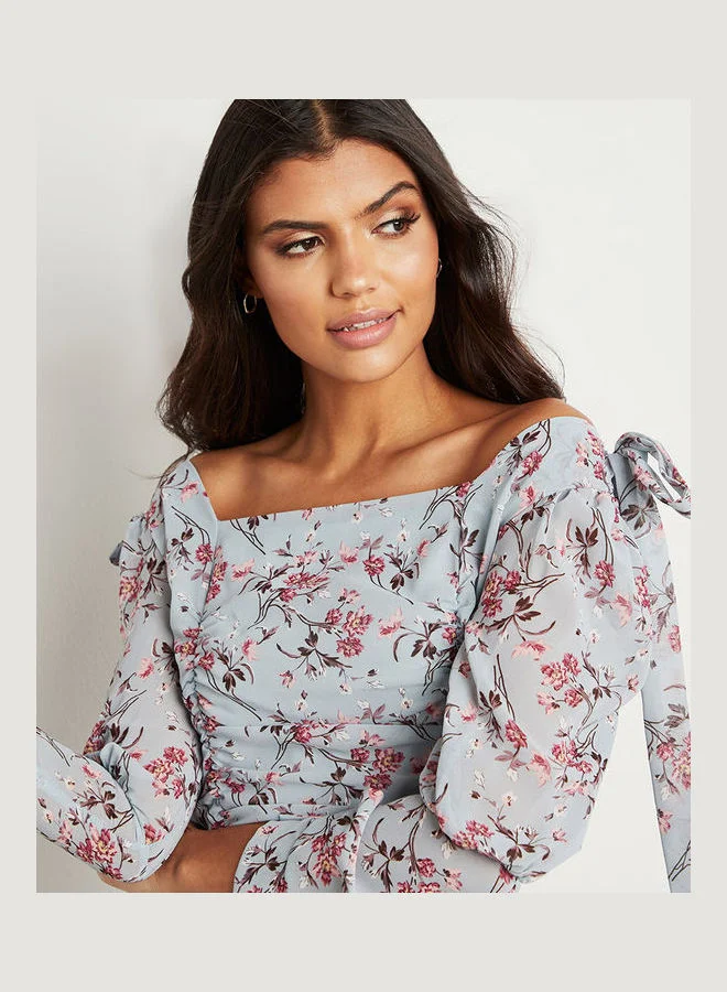 Closet By Styli Floral Print Tie-Up Shoulder Crop Top Blue/Pink