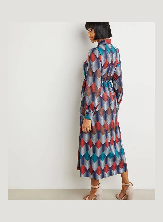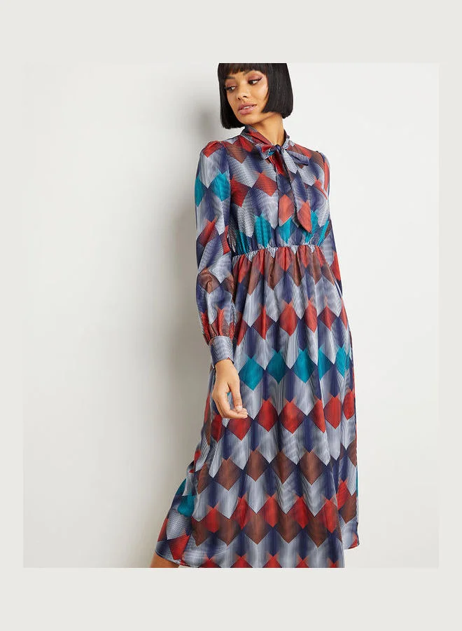 Closet By Styli Geo Print Tie-Up Neck A-Line Midi Dress Multicolour