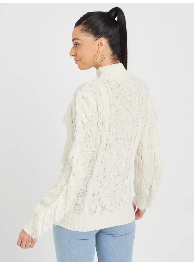 Closet By Styli Long Sleeve Fringe Detail High Neck Regular Fit Sweater Cream