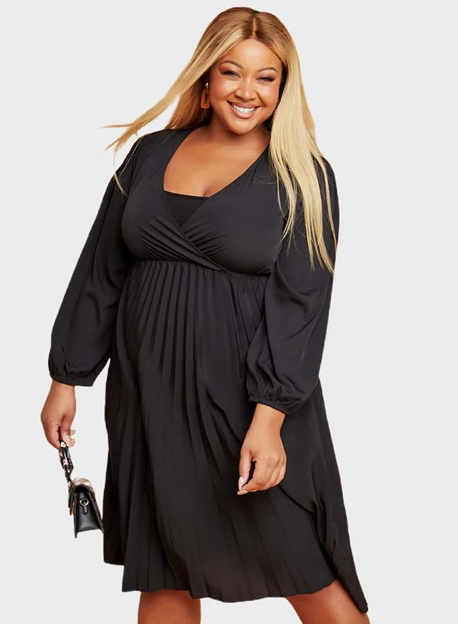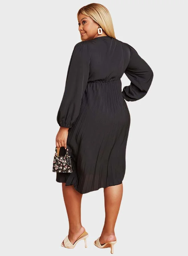 Closet By Styli Pleated Detail Puff Sleeve Midi Dress Black