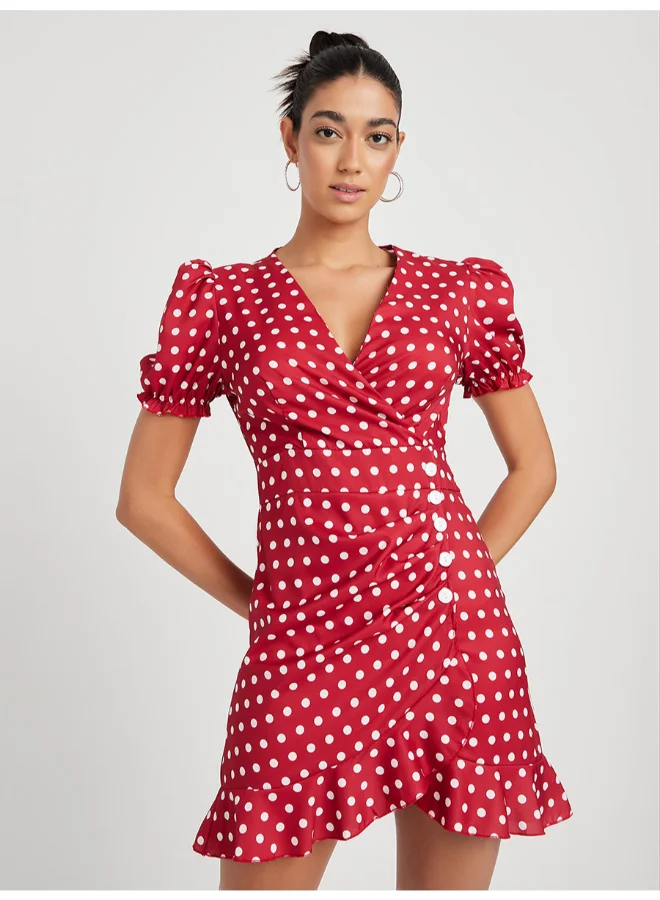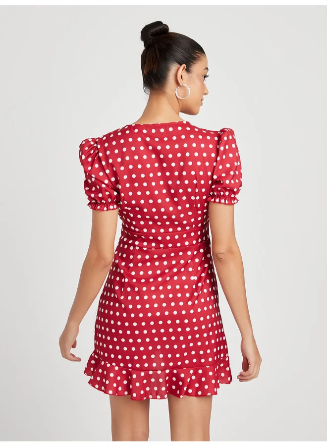 Closet By Styli Polka Dot Printed Ruffle Detail Bodycon Mini Dress Red/White