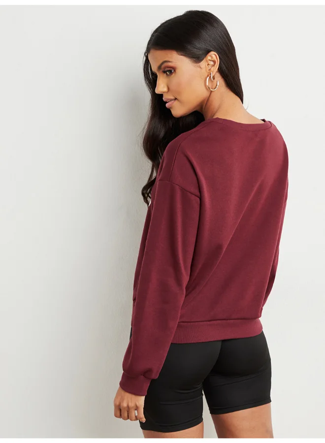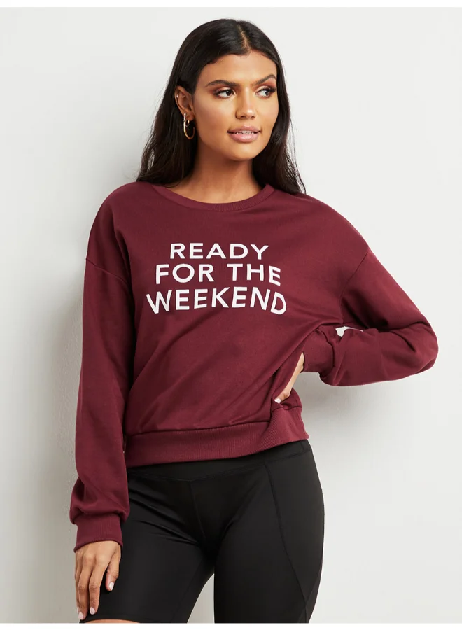 Closet By Styli Round Neck Printed Sweatshirt Burgundy Red/White