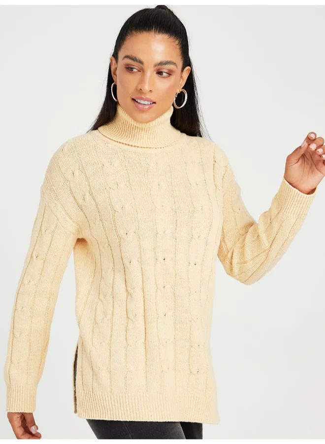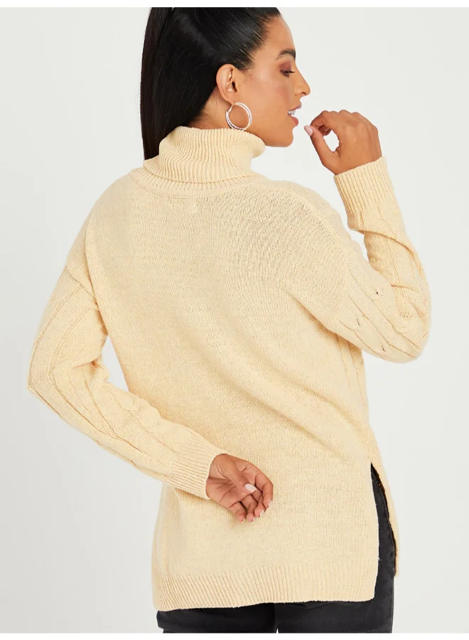 Closet By Styli Side Slit Cable Knit Turtle Neck Longline Sweater Beige