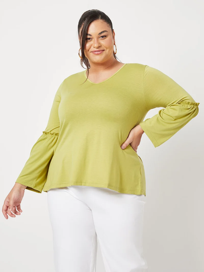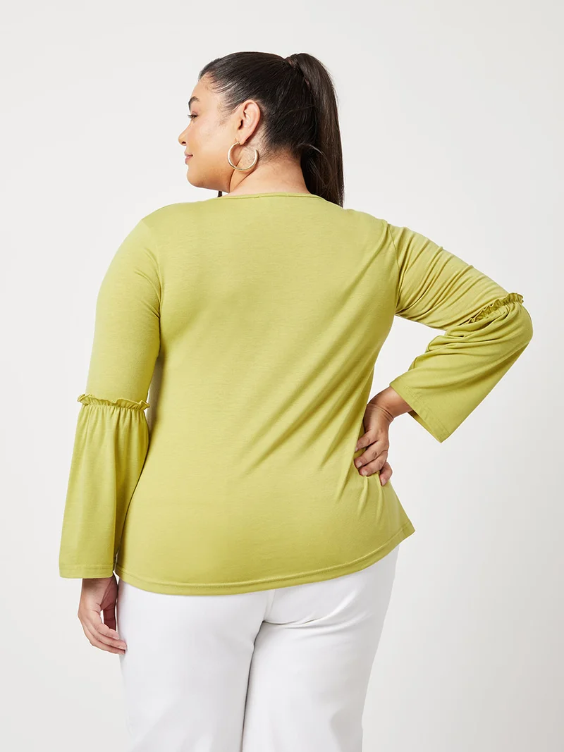 Closet By Styli Solid Pattern Flute Long Sleeve Top Green