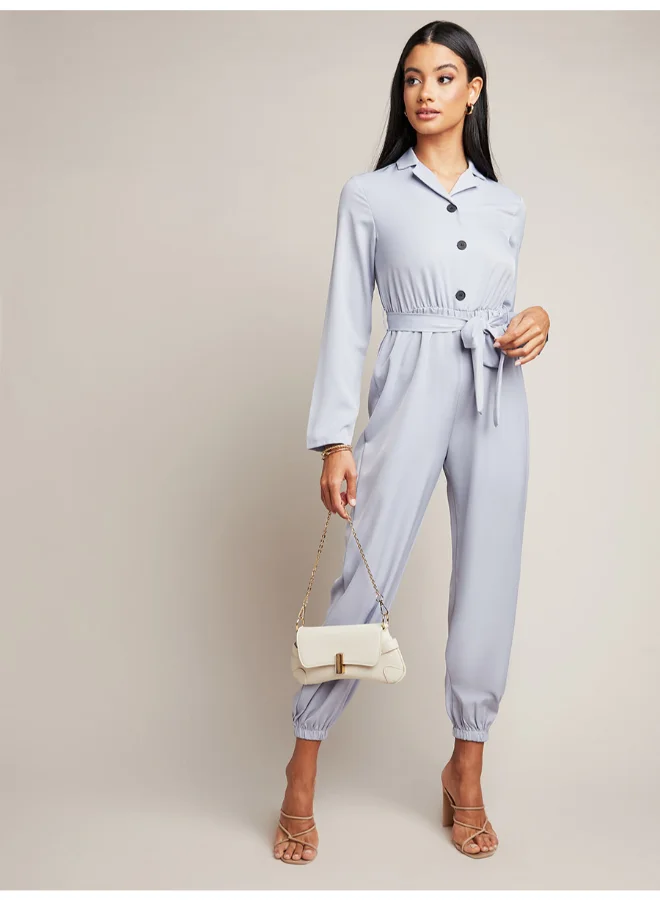 Closet By Styli Tie Belt Detail Collared Neck Cuffed Jumpsuit Blue