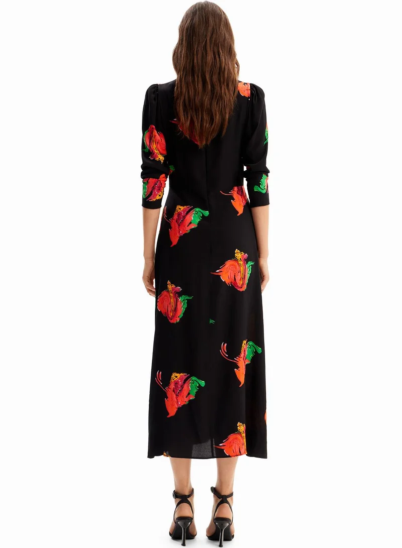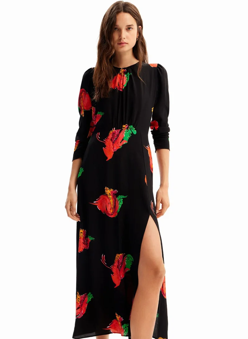 This long-sleeved maxi dress features a vibrant red and green floral pattern on a black background and a side slit. The dress has a round neckline and a fitted bodice, creating a flattering silhouette.