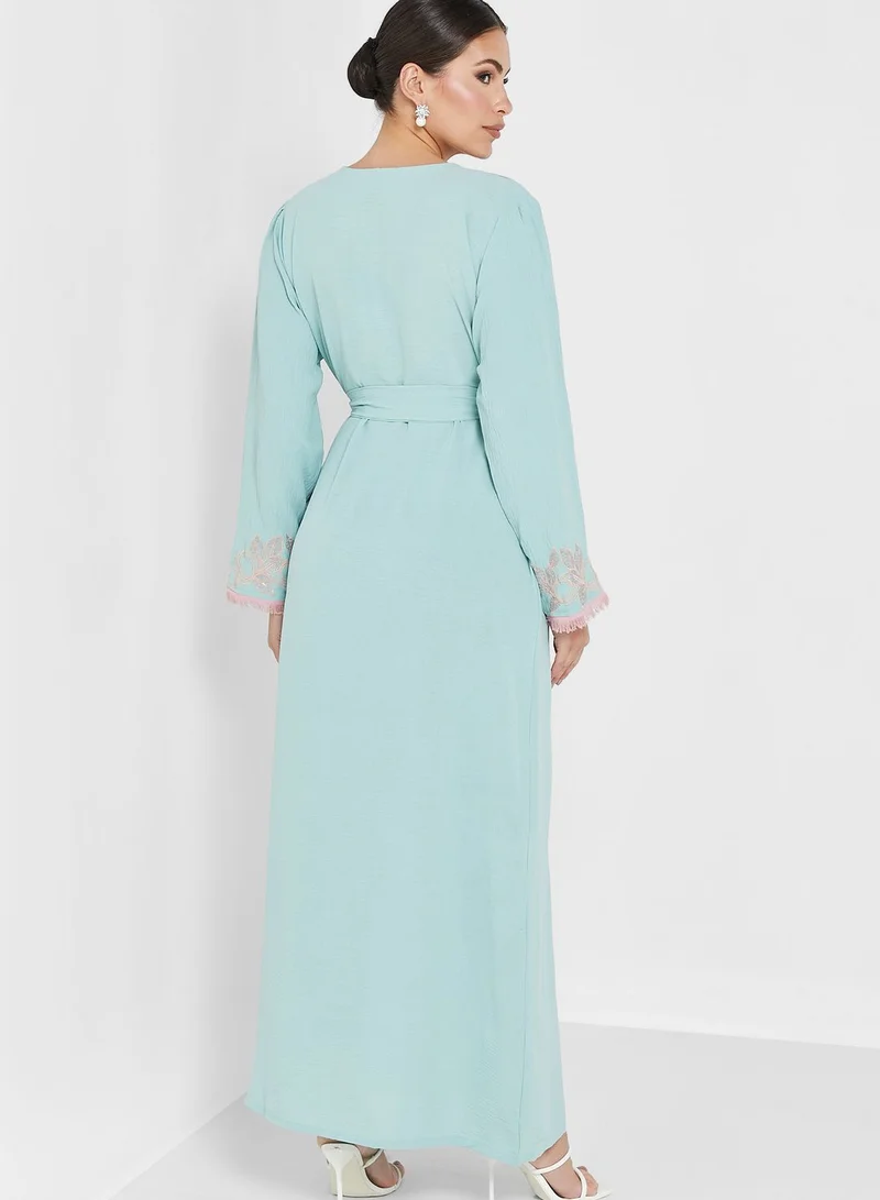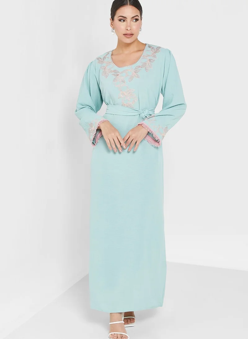 The intricate detailing on this jalabiya will add a luxurious touch to your everyday edits. Designed with a traditional flowing silhouette.