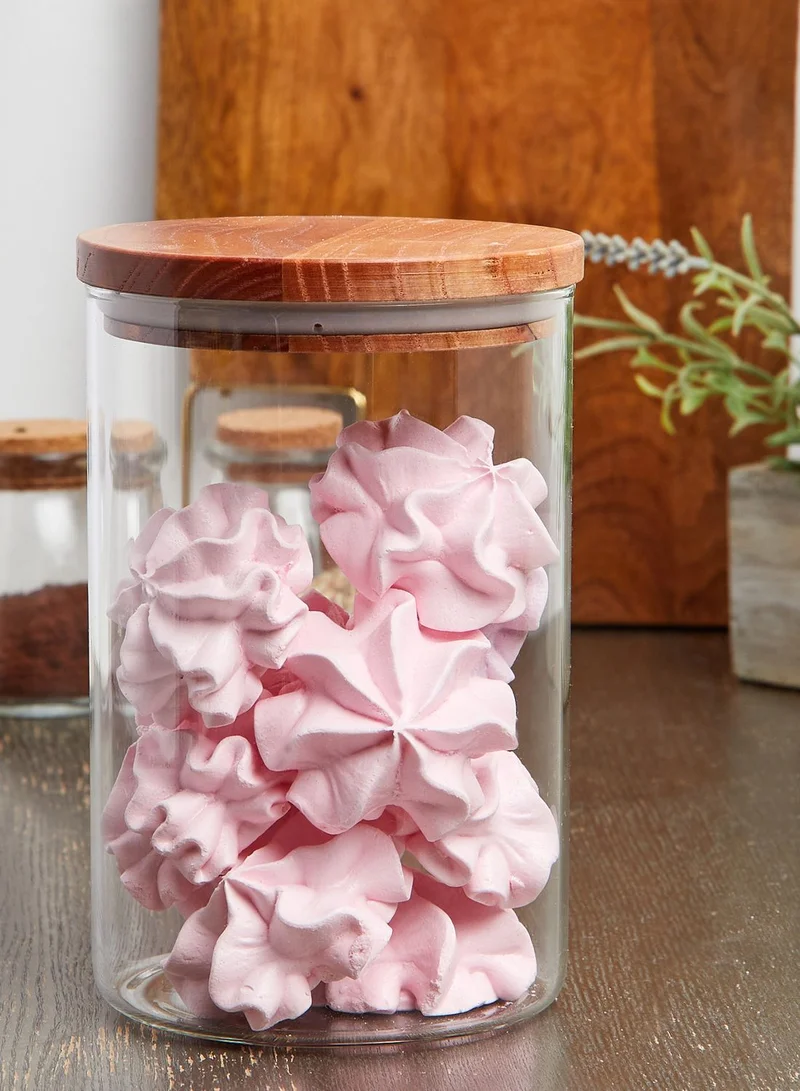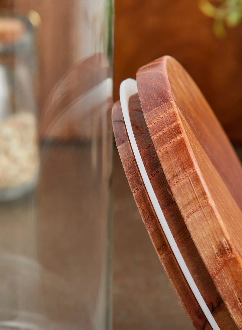 A transparent storage pot made of glass with a wooden lid. The pot can be used to store foodstuffs. And because the pot is transparent, you can see the contents. The wooden lid is not dishwasher-safe, but the glass pot is.