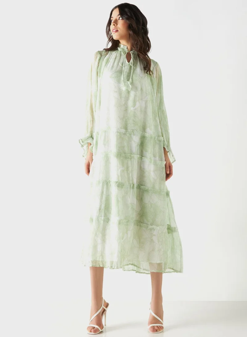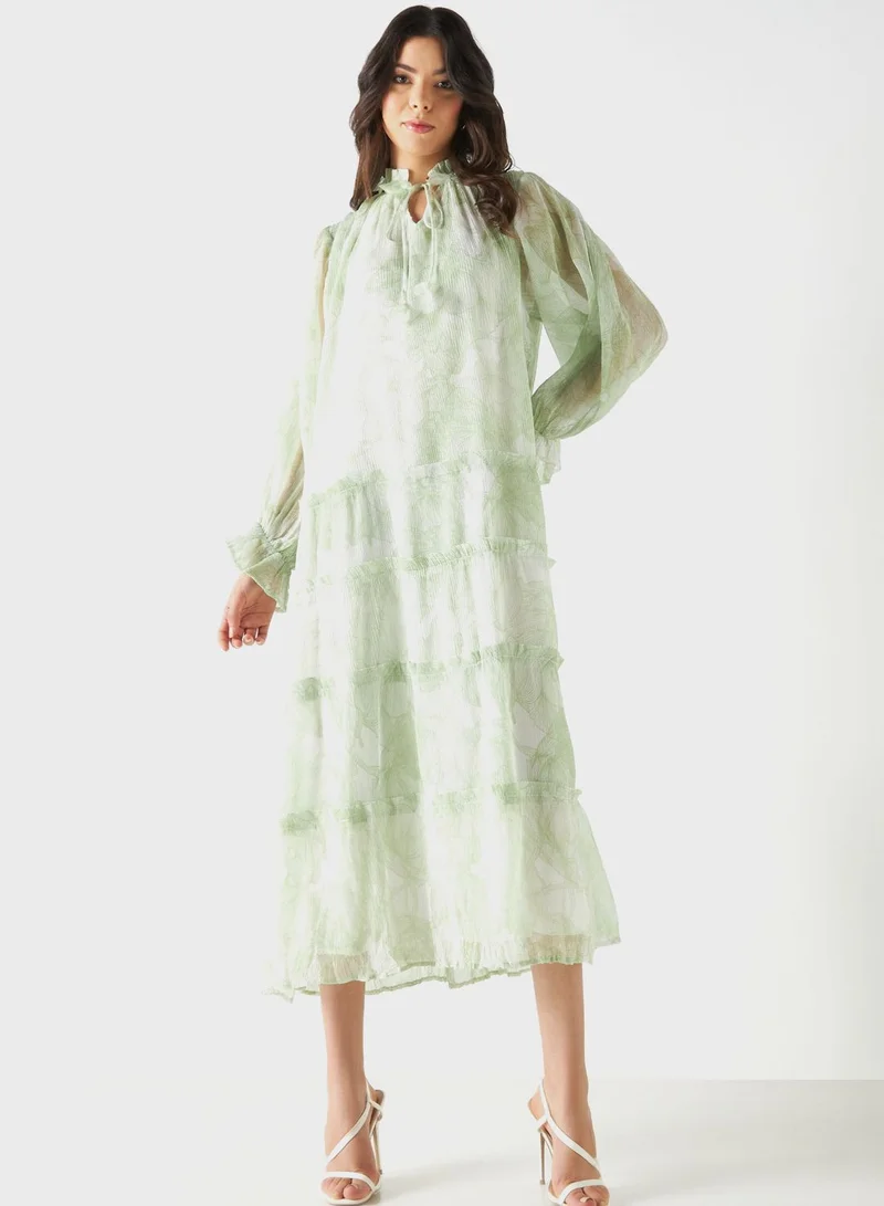This flowing midi dress features a delicate green print, a tiered silhouette, and long chiffon sleeves. It offers a soft and airy look.