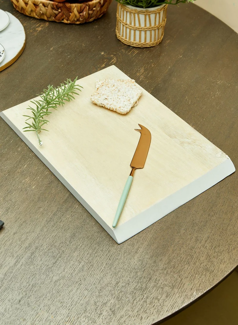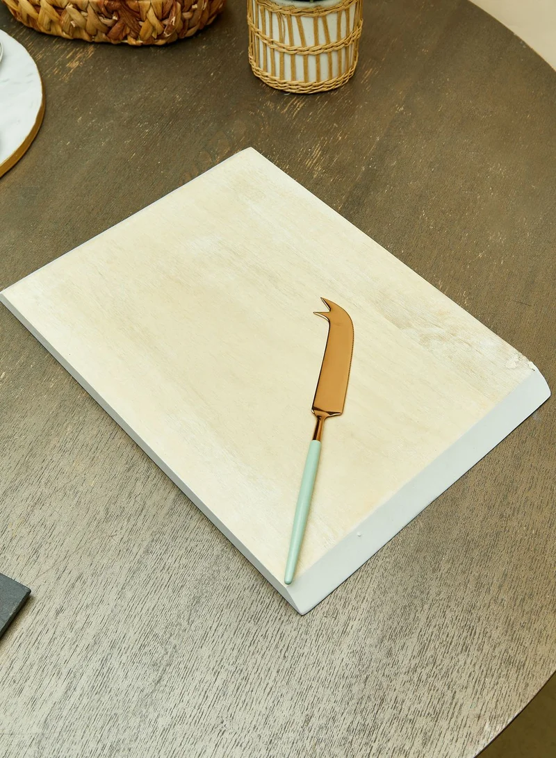 Add style to any table with this gorgeous white washed mango wood cheese board. Unique in shape this wooden cheese board features contemporary crisp white angled sides. It is also complete with a complimentary cheese knife. Whether you use this stunning set for serving cheese and crackers at a get together or as a feature in the centre of a table at a dinner party it will make for a stylish serving option for your home.