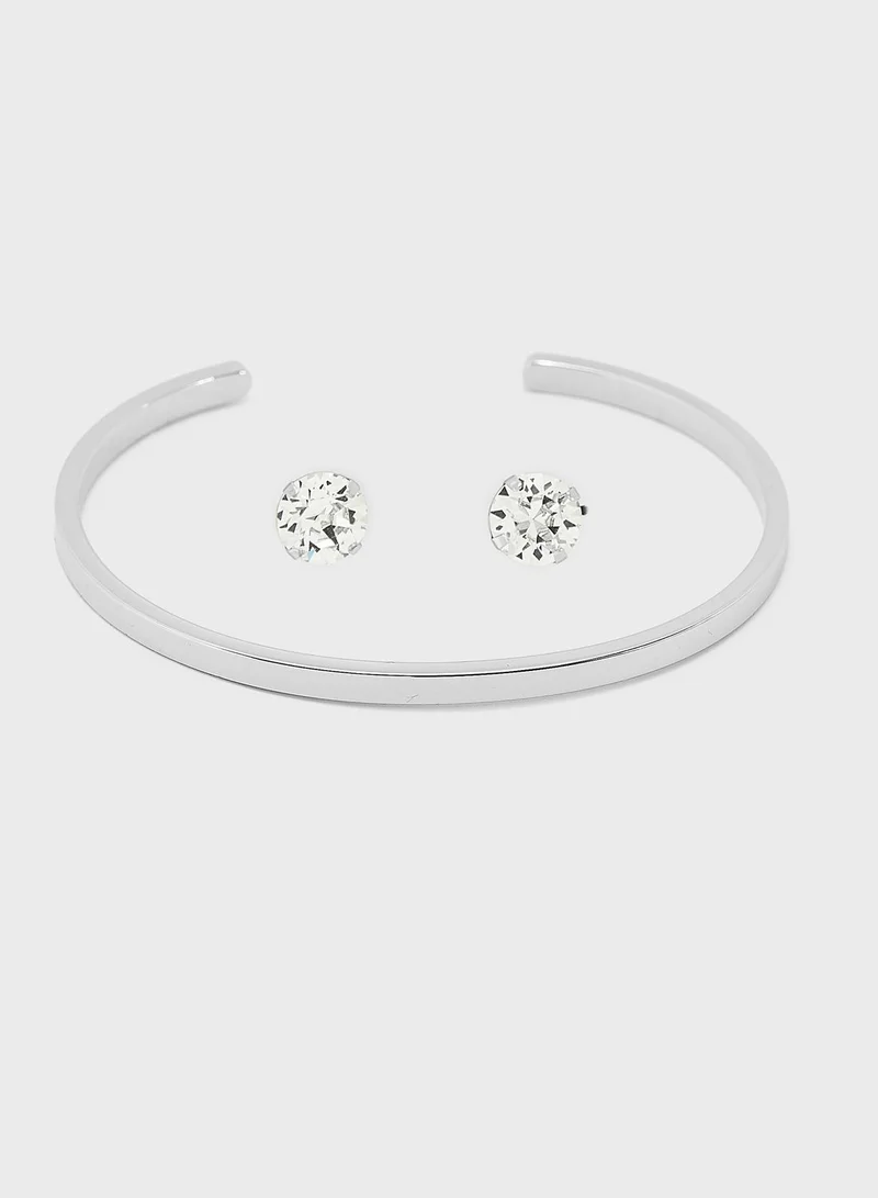 This set is a must-have for any collection. A simple yet chic cuff is paired with a beautiful pair of our signature stud earrings with Swarovski Crystals. These pieces look amazing stacked or worn alone.