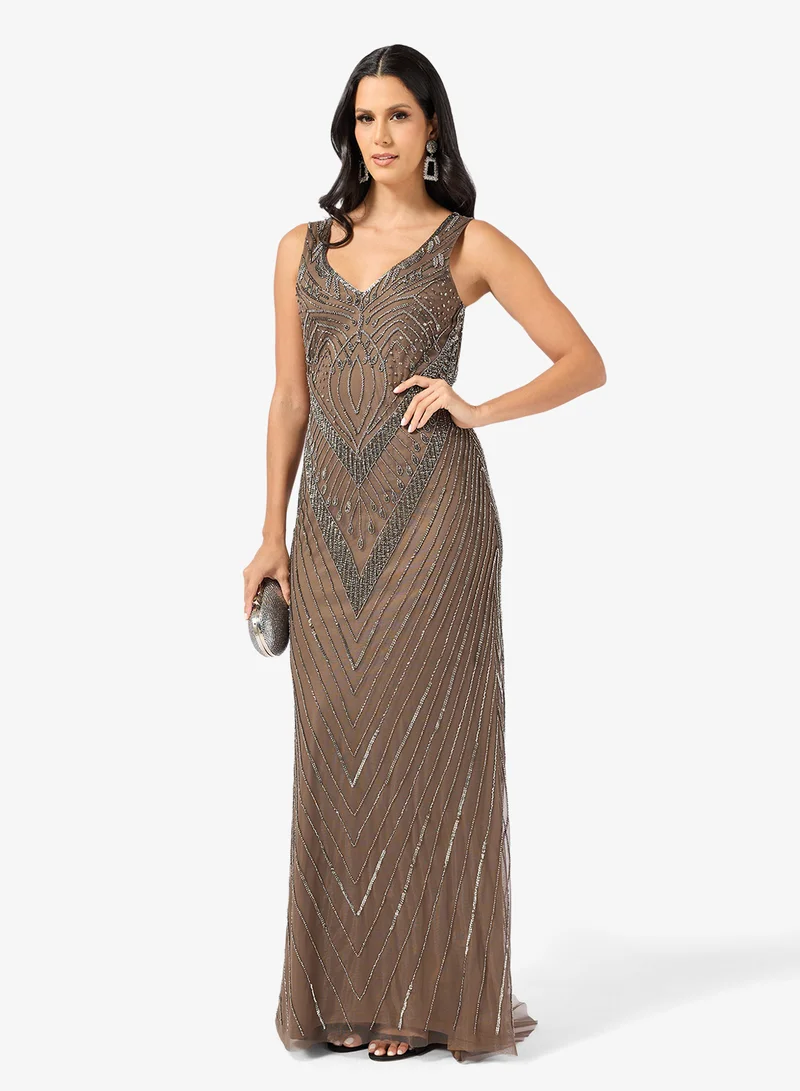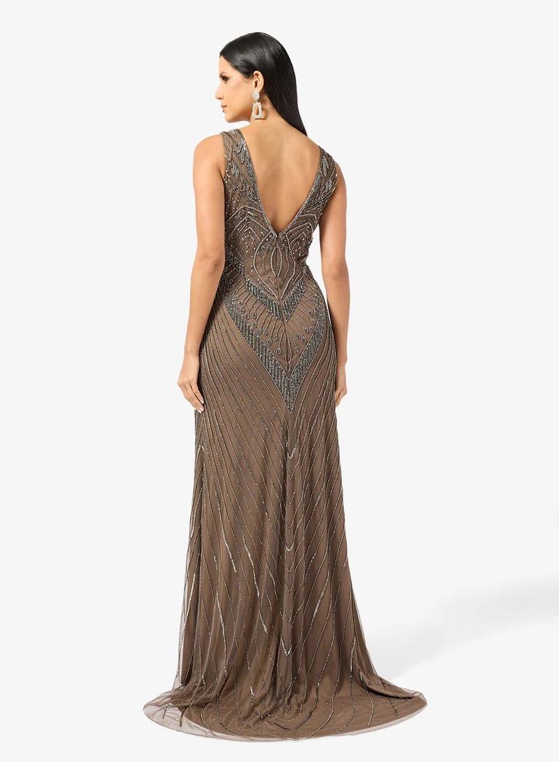 Namshi x Plunge Neck Bead Embellished Evening Gown