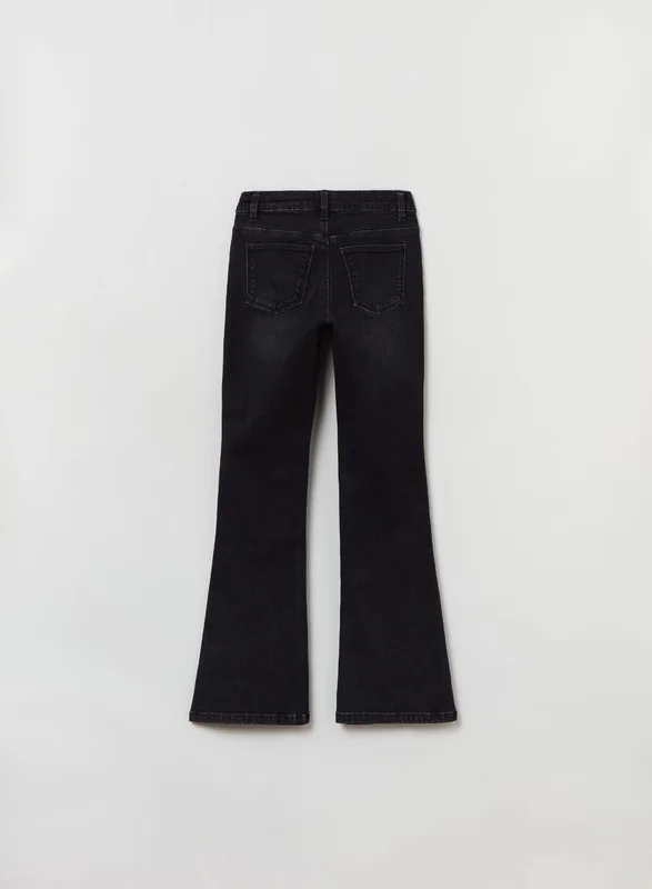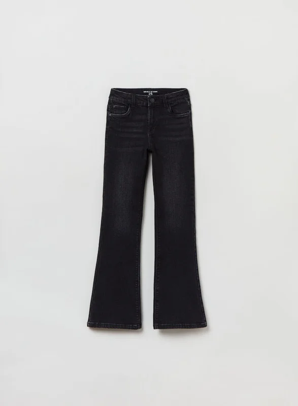Flare-fit stretch cotton jeans. Five pockets. Zip and button fastening.