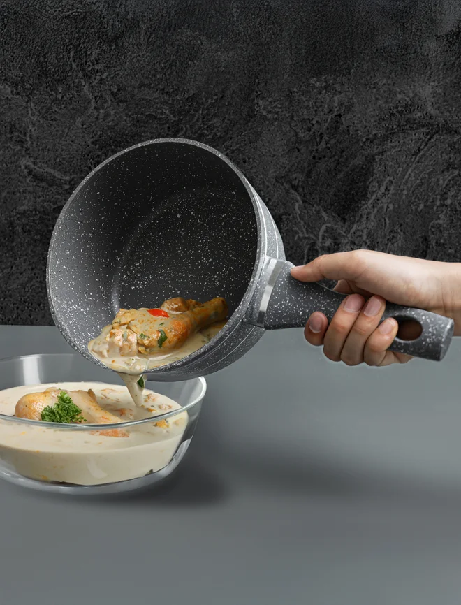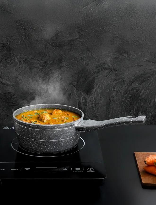 This saucepan is made with aluminium that is treated for maximum sturdiness. Use it for boiling or braising for long durations, and it can withstand heat. It can be used for making unique recipes.