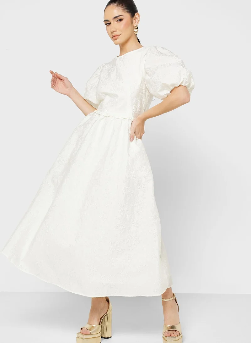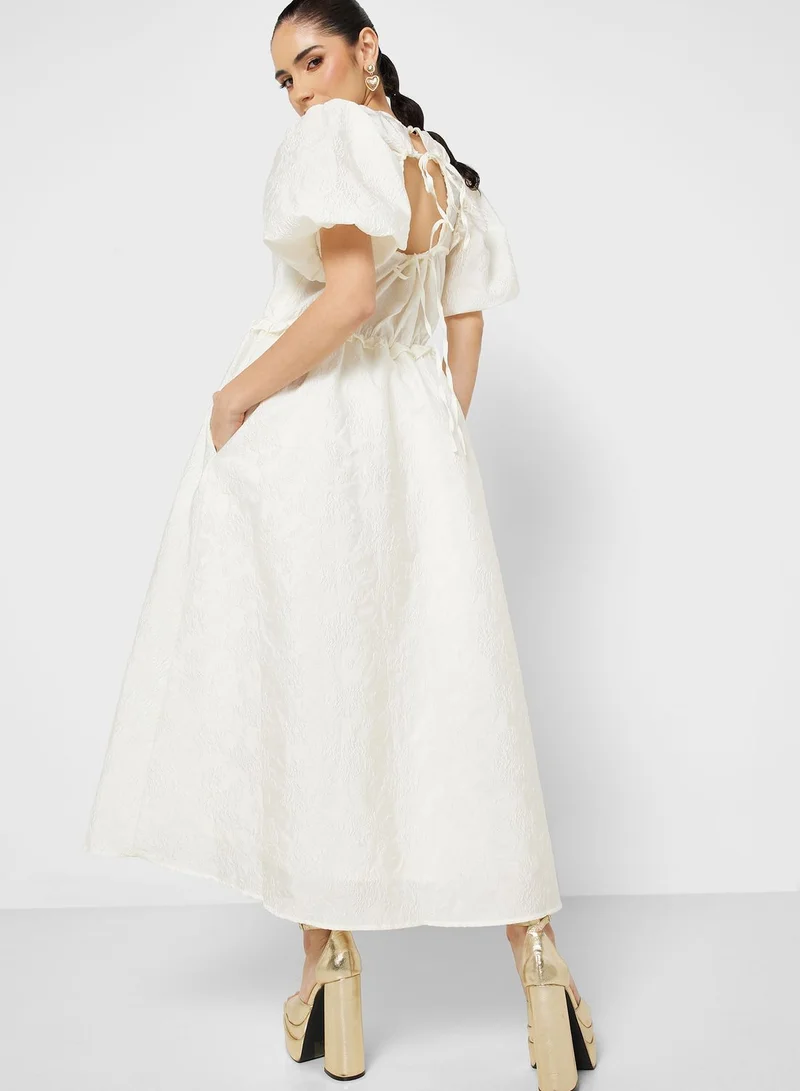 This elegant, textured dress features charming puff sleeves and an open back with delicate tie detailing, offering a romantic and feminine touch. The A-line skirt flows gracefully to a midi length, making it perfect for special occasions.
