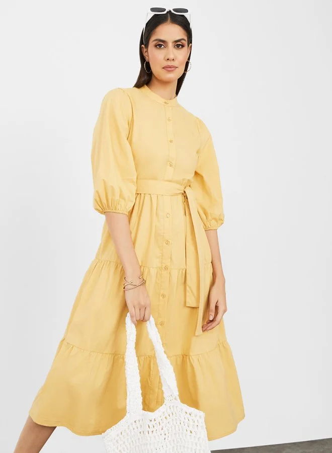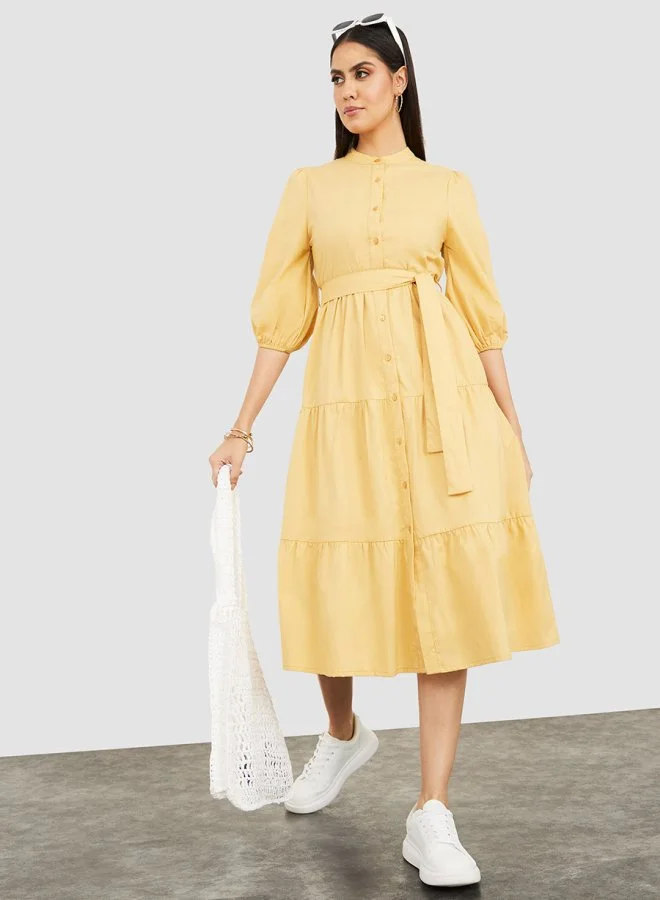 Styli 3/4 Sleeves Plain Tiered Midi Dress