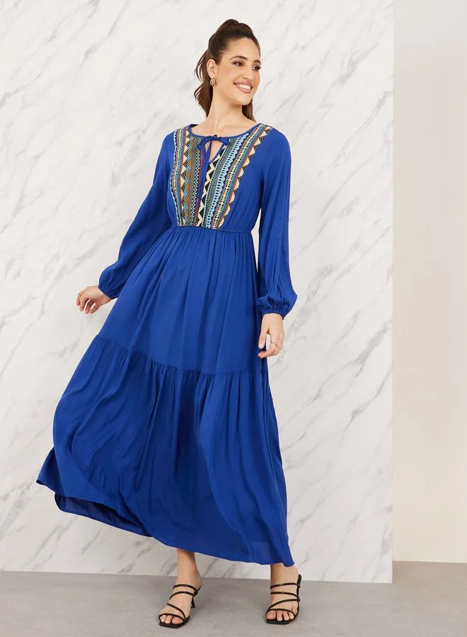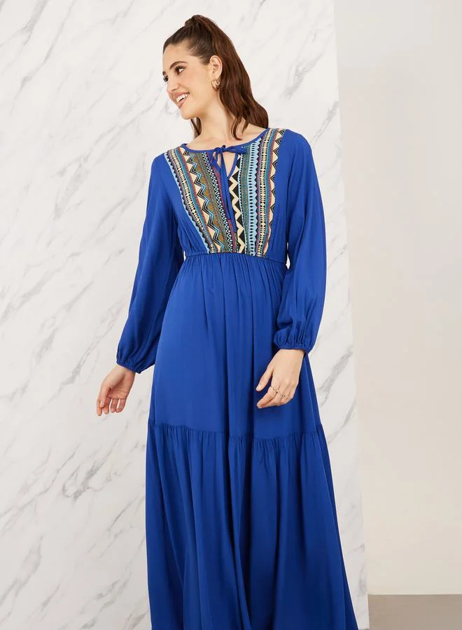 Styli Aztec Printed Tie Up Neck Tiered Maxi Dress